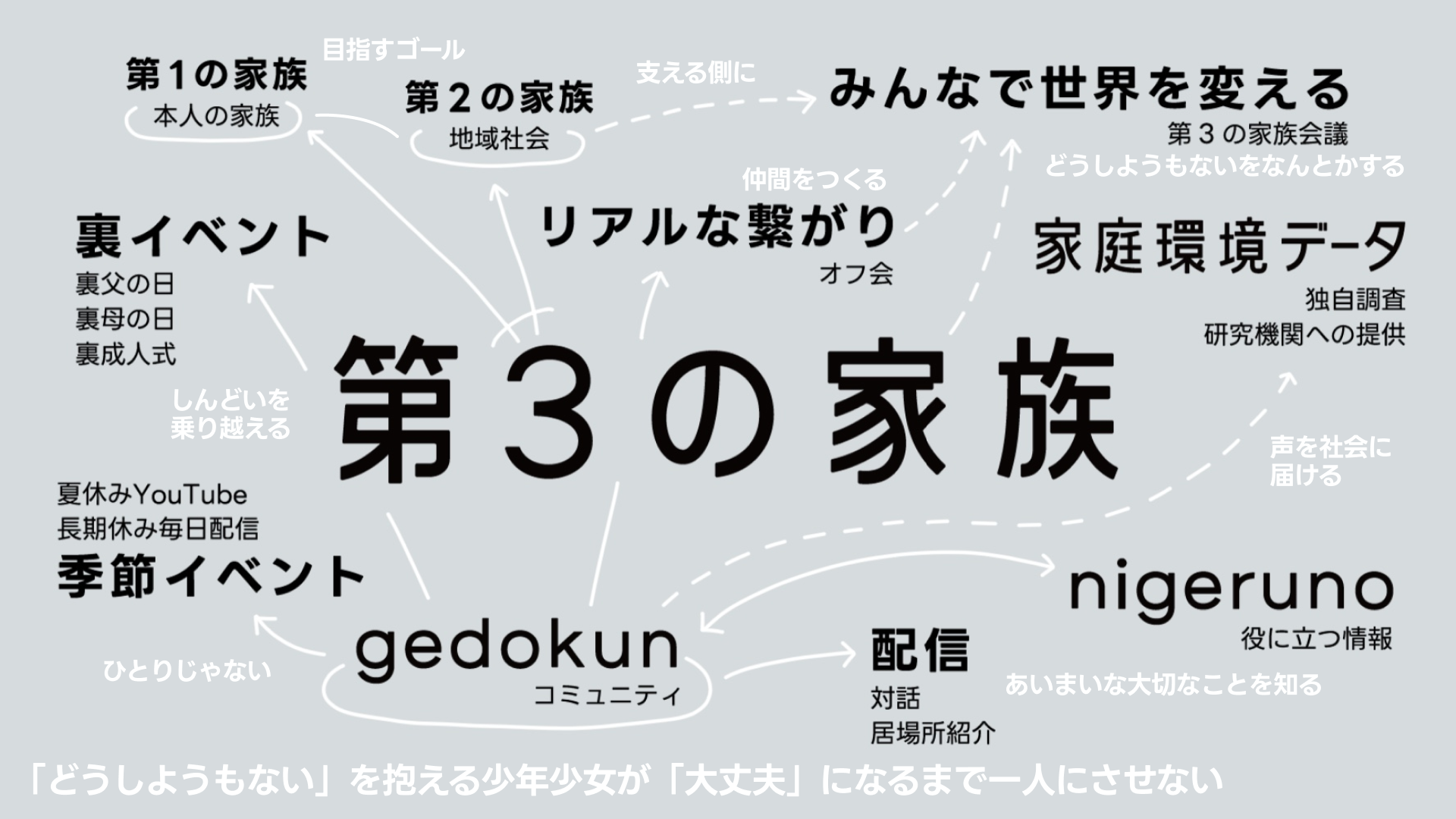 | 提供サービス | コミュニティサイト:gedokun 情報サイト:nigeruno 調査事業:家庭環境データ オンライン・オフラインイベント |